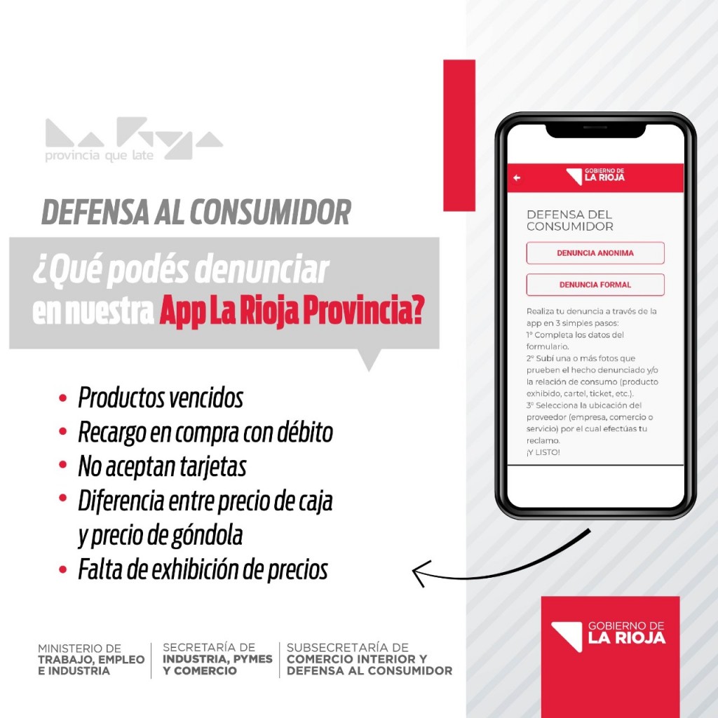 La Subsecretaría de Comercio Interior y Defensa al Consumidor informó a la población que, mediante la aplicación móvil La Rioja Provincia puede realizar denuncias por incumplimiento a sus derechos en los comercios.