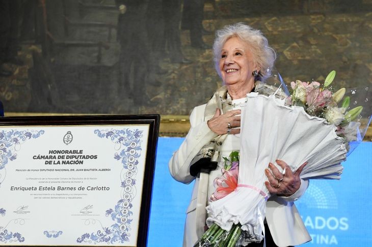 La titular de Abuelas de Plaza Mayo, Estela de Carlotto, recibió este miércoles de manos del presidente de la Cámara de Diputados, Sergio Massa, la "Mención de Honor Juan Bautista Alberdi" por su compromiso en la defensa de los derechos humanos.