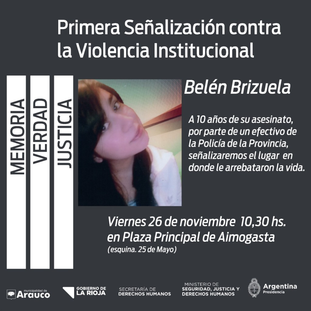 Al cumplirse el 10 ° Aniversario del asesinato de María Belén Brizuela, a manos de un efectivo de la Policía de la Provincia, se colocará frente a la Plaza Principal de Aimogasta, en el lugar donde perdió la vida la joven de 16 años, un cartel como símbolo de lucha contra la Violencia Institucional, junto a la Secretaría de Derechos Humanos de la Nación y a la Municipalidad de Arauco.