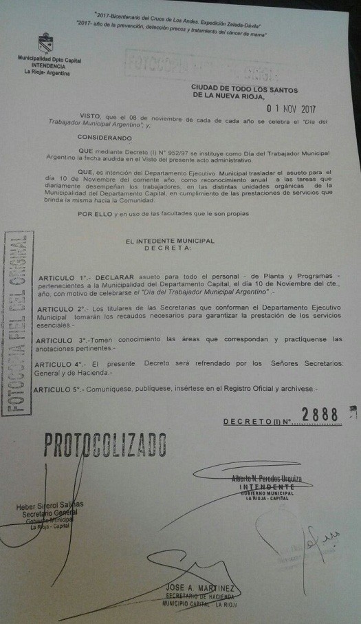Con motivo de que el pasado miércoles 8 se celebró en toda la Argentina el día del empleado municipal, el Ejecutivo Municipal dispuso mediante decreto N°2888 establecer un asueto para todos los empleados de la comuna ya sean de planta o pertenezcan a un programa.
