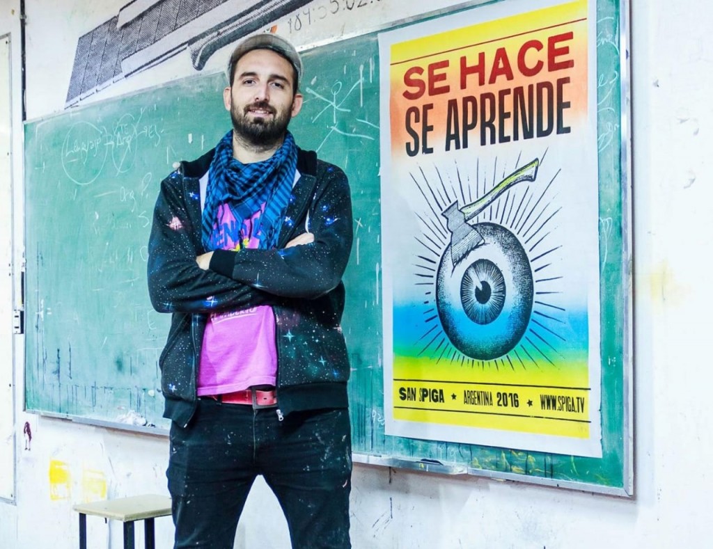 Santiago Spigariol, más conocido como “San Spiga”, es diseñador gráfico, docente y artista urbano, nacido en Viedma, Río Negro, y desde hace años desarrolla su obra visual en formato de pósters y arte urbano en festivales, cárceles, barrios y centros educativos.
