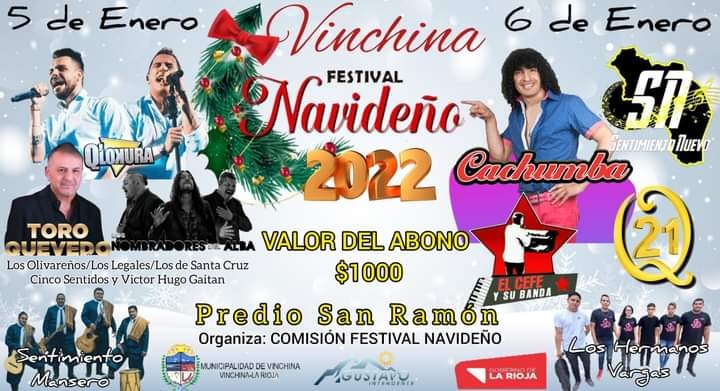 La 30 edición del Festival Navideño en Vinchina será los días 5 y 6 de enero, con una grilla de primer nivel y un valor muy accesible, siendo el valor del abono para las dos noches de $1.000 y el mismo se realizará en el tradicional escenario natural cerro "San Ramon".