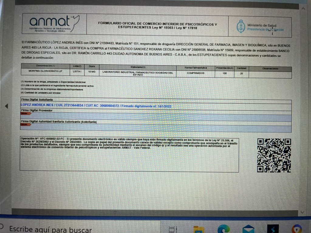 Desde la Dirección de Fiscalización informaron que se hizo una operación para solicitar la provisión de morfina comprimidos al Banco Nacional de Drogas Especiales (BNDE) de Nación utilizando por primera vez el Vale Federal, una herramienta que utiliza Firma Digital y que agilizará de manera sustancial los trámites legales de las operaciones de comercio interior de psicotrópicos y estupefacientes.