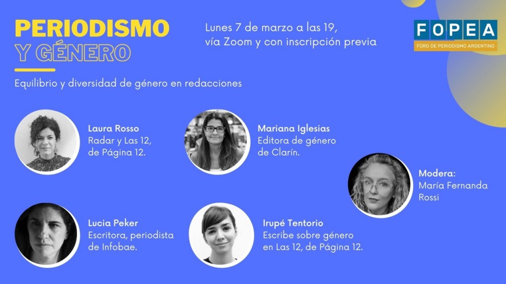 Organizado por FOPEA, la moderadora será Maria Fernanda Rossi y participarán: Mariana Iglesias, editora de género de Clarín; Laura Rosso, Página 12; Lucia Peker, Infobae e Irupé Tentorio, escritora de género de Página 12.
