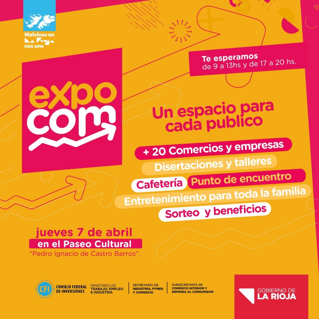 El Gobierno de La Rioja, a través de diferentes instituciones y organismos, llevará adelante la primera edición de la Expo Comercio (Expo Com) este jueves 7 de abril, de 9 a 13 y de 17 a 20.30, en el Paseo Cultural Castro Barros