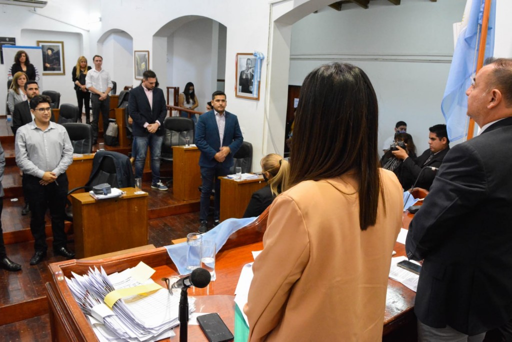 Tras ser recibidos e invitados por el viceintendente Guillermo Galván, izaron las banderas de ceremonia, mientras que le hicieron entrega al Concejo de una bandera con las Islas Malvinas, que durante todas las sesiones estará presente cubriendo el estrado.