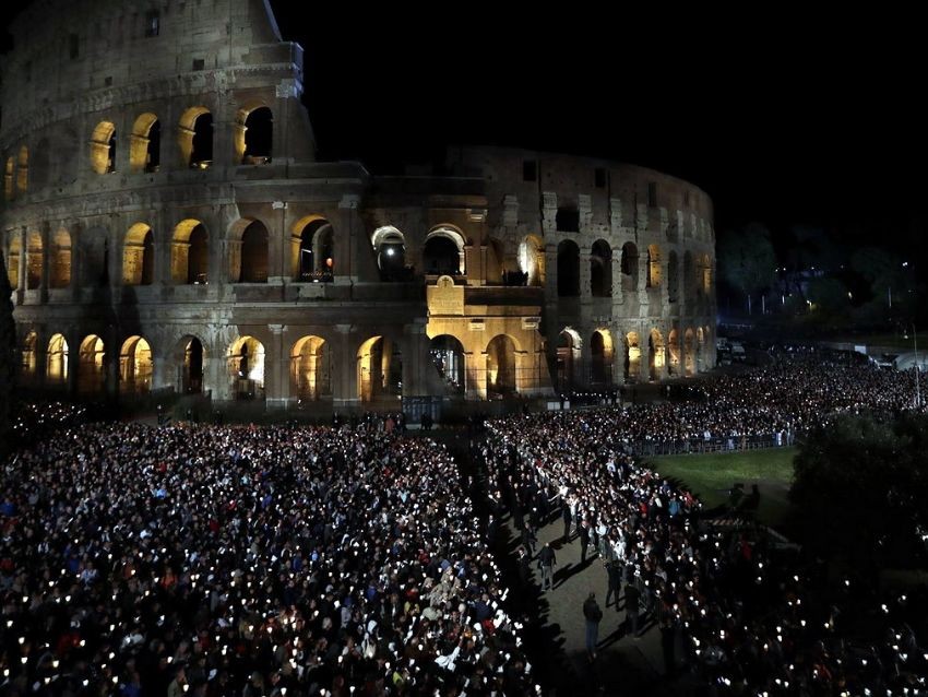 Francisco, mientras tanto, se mantuvo serio y reflexivo y siguió el acto desde un palco colocado al pie del monte Palatino, situado frente al anfiteatro Flavio, hasta que pronunció su oración final cerca de las 22.30 locales. El Vaticano calculó que unas 10.000 personas participaron de la celebración.