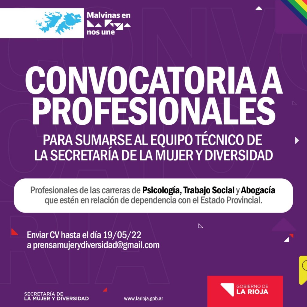 La Secretaría de la Mujer y Diversidad convoca a profesionales de las carreras de Psicología, Trabajo Social y Abogacía, que estén en relación de dependencia con el Estado Provincial, para prestar servicios en las inmediaciones de esta Secretaría y sus respectivos dispositivos