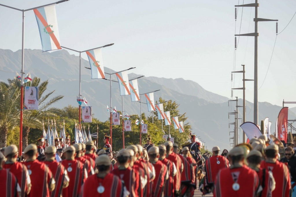 Luego, el jefe de la Agrupación 20 de Mayo, le solicitó al gobernador autorización para dar inicio al Desfile Cívico-Militar que inició con destrezas aéreas a cargo de la Fuerza Aérea Argentina, y luego se hizo la apertura artística denominada "Tinkunaco de riojanidad".