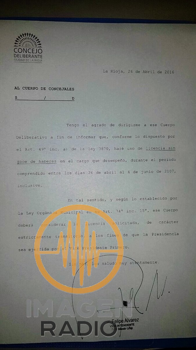 El viceintendente y primer candidato a Diputado Provincial por “Encuentro por La Rioja”, Felipe Álvarez, anunció esta mañana la decisión de tomar licencia al frente del Concejo Deliberante. Así lo hizo considerando que es la línea de acción que corresponde, en un marco de transparencia, respeto de las instituciones y, fundamentalmente, un comportamiento con ética pública.    En un breve comunicado a través de sus redes sociales, Felipe Alvarez comunicó su licencia transitoria en las funciones de Presidente del Concejo Deliberante, cuya duración será efectiva desde este 26 de Abril hasta el día 4 de Junio, fecha de los comicios.   Álvarez destacó que "debemos actuar con sentido común y respetando las formas con los ciudadanos. Durante una campaña, los candidatos que encabezan las listas debemos llevar nuestro mensaje y hacer conocer nuestro trabajo por toda la Ciudad. Tomar esta licencia en mi actividad habitual es lo que corresponde." Además, para despejar cualquier duda y actuar con sentido ético, agregó que su licencia será sin goce de sueldo.    Durante este periodo, la presidencia del Concejo Deliberante será ejercida por el Vicepresidente Primero Oscar Luna, quien continúa en la línea de sucesión formal, según el reglamento del cuerpo deliberativo municipal.