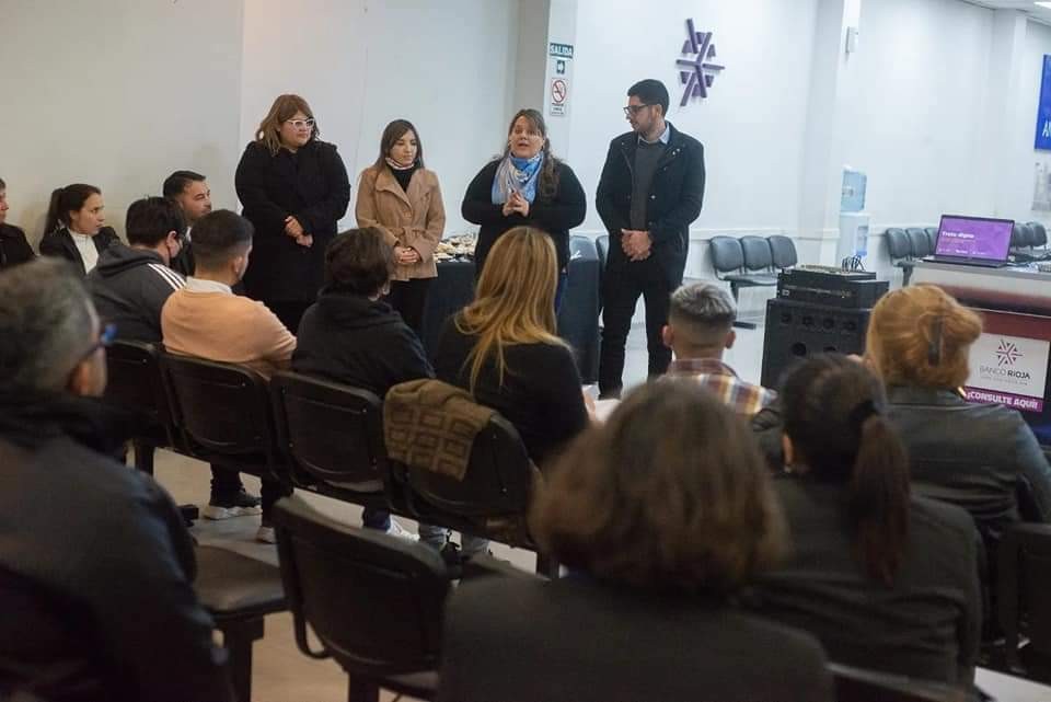 La secretaria de la Mujer y Diversidad, Karen Navarro, junto a la subsecretaria de Gestión y Planificación, lic. Analía Yoma, la directora de Capacitación, Romina Ruarte y el director de Políticas Públicas de Integración, lic. Guillermo Pereyra, estuvieron presentes en la capacitación a integrantes del programa “Trato digno”, que llevaron adelante Raúl Cabral, gerente general del Banco Rioja, junto a Daniela Rodríguez, síndica del banco.