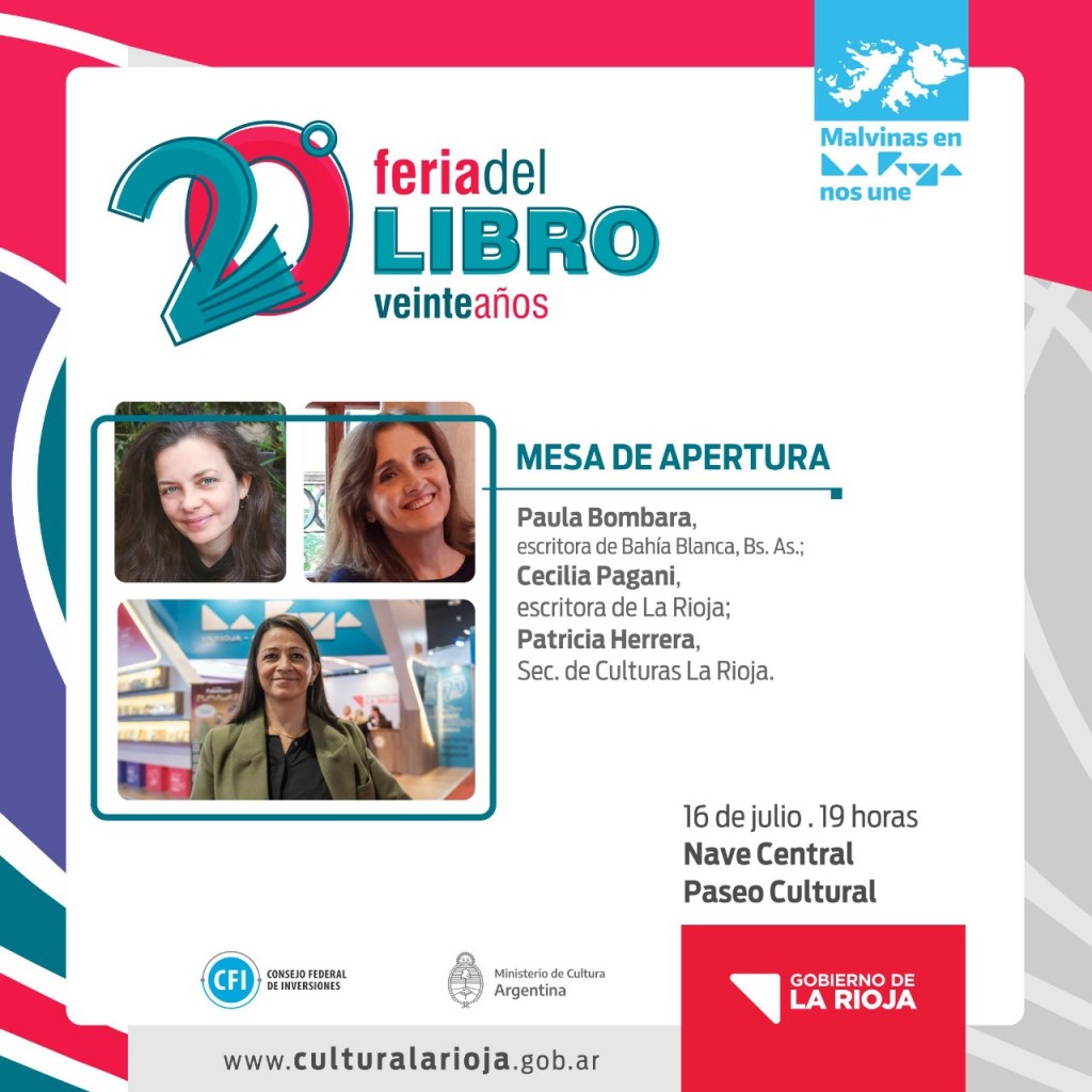 De la misma, participarán la escritora de Bahía Blanca, Paula Bombara; la escritora riojana, Cecilia Pagani; y la secretaria de Culturas de La Rioja, Patricia Herrera.