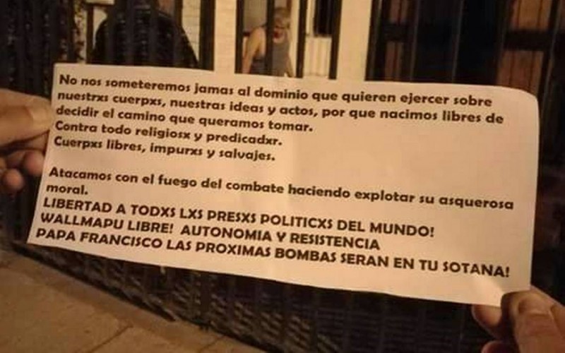 Los panfletos arrojados en los lugares donde se perpretaron los ataques decían: "Libertad a todos los presos políticos del mundo, Wallmapu (territorio mapuche) libre, autonomía y resistencia. Papa Francisco las próximas bombas serán en tu sotana".
