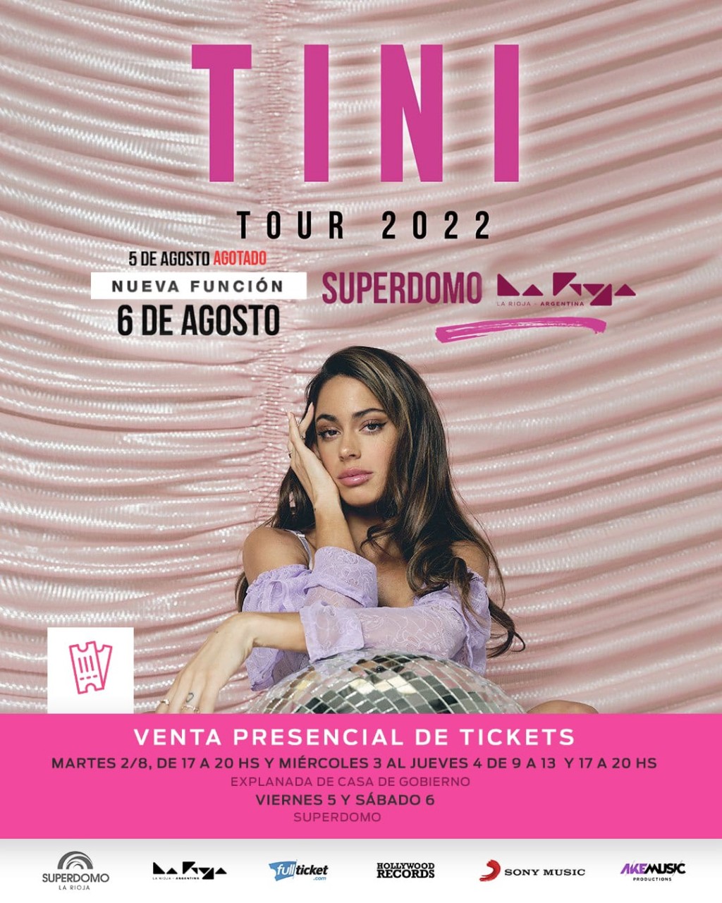 El Gobierno de la Provincia de La Rioja comunica que a partir de hoy se podrán adquirir de manera presencial las entradas para el show de Tini Tour 2022 que tendrá lugar este viernes 5 y sábado 6 de agosto. Las entradas se podran adquirir en la explanada de Casa de Gobierno y el Superdomo