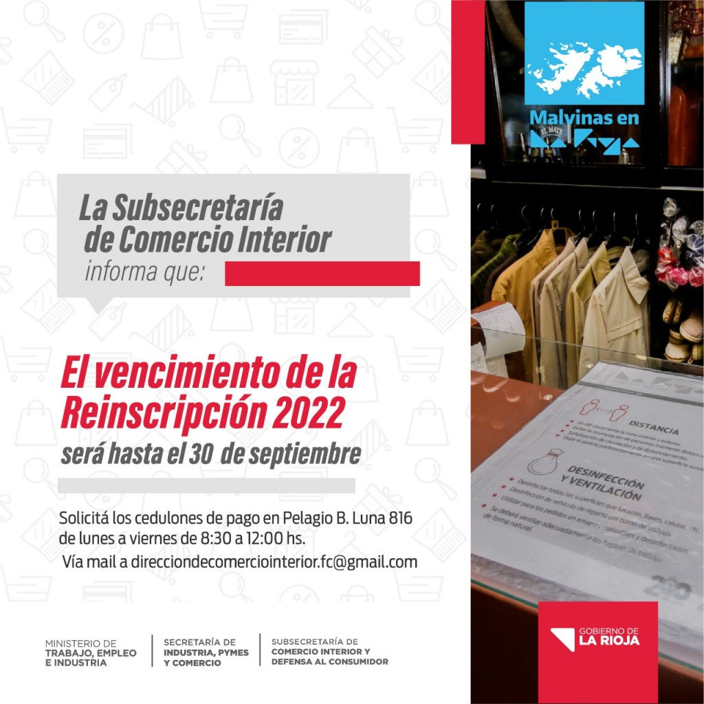 La Secretaría de Industria y de la Subsecretaría de Comercio Interior, informan que se encuentra disponible la Reinscripción 2022 del Fondo de Comercio destinada a comerciantes y prestadores de servicios, con vencimiento al 30 de septiembre del corriente año.