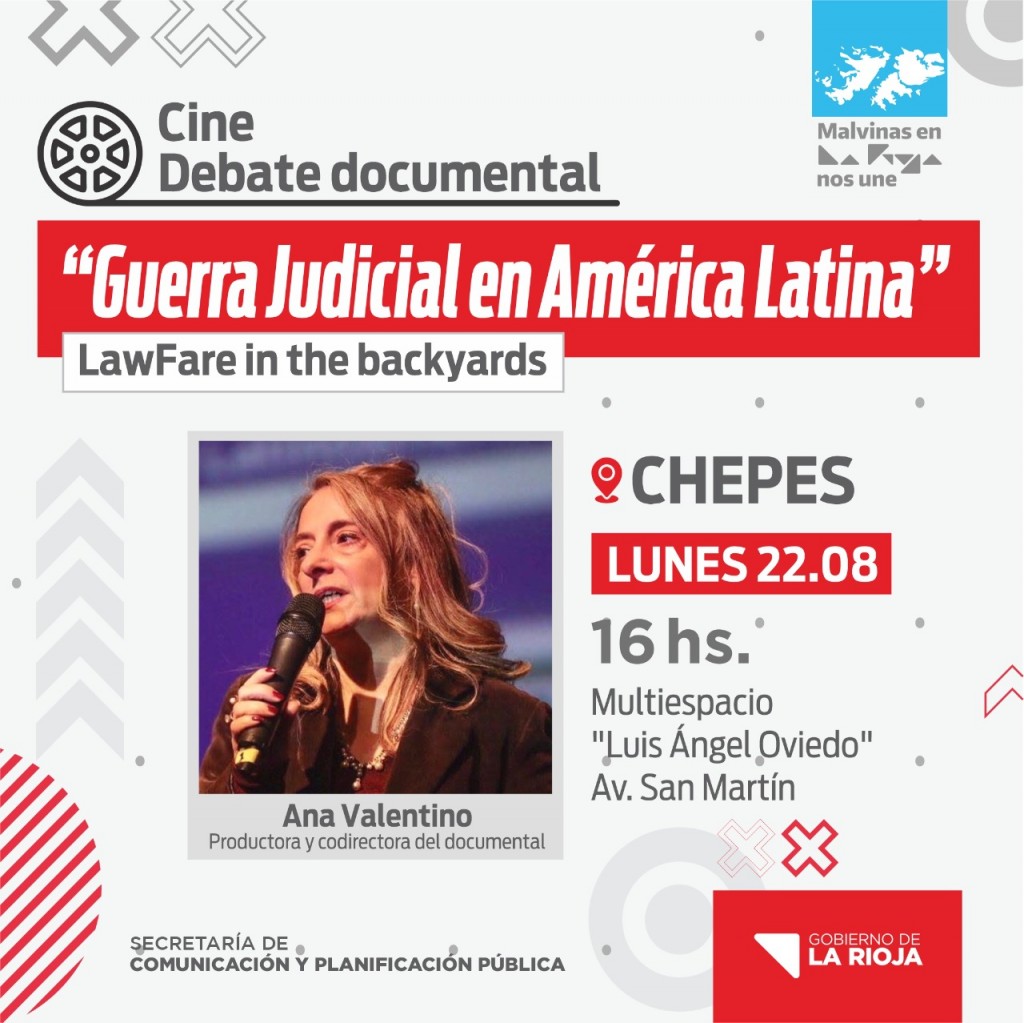 La Secretaría de Comunicación y Planificación Pública invita a la actividad Cine Debate Documental “Guerra Judicial en América Latina” Lawfare the backyards, a cargo de Ana Valentino productora y directora documental que se realizará este lunes 22 y martes 23 en Chepes y Chamical, respectivamente.