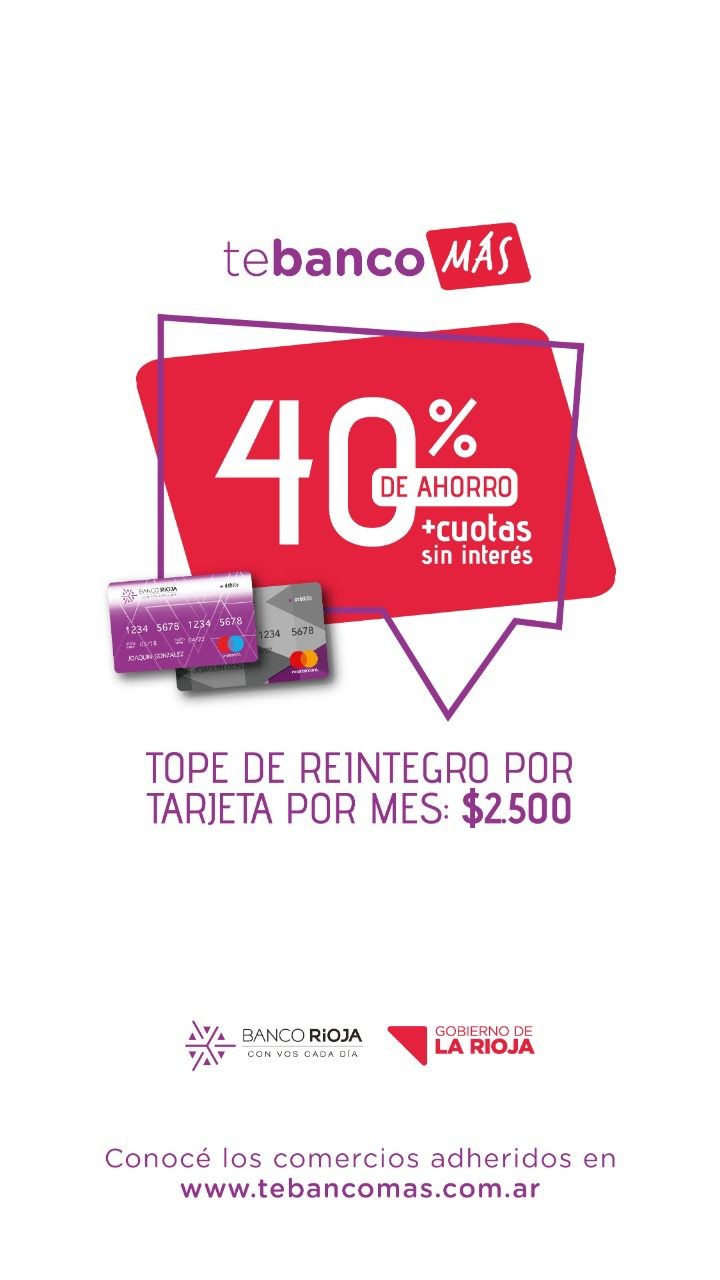 Las familias riojanas podrán ahorrar hoy- y todos los martes hasta octubre- inclusive el 40% de su compra en supermercados y otros rubros. Con “Te Banco Más” se puede comprar en más de 230 comercios adheridos de La Rioja con débito y Mastercard BR. El tope de reintegro mensual por tarjeta es de $2500.