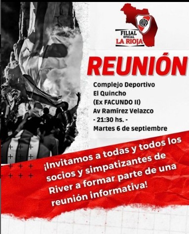 El presidente de la Filial La Rioja, Matías Troncoso, informó que este martes se realizará una reunión en el salón Facundo II a las 21:30 horas con todos los socios y simpatizantes del conjunto millonario que deseen asistir. En la oportunidad se abordarán varios temas y principalmente se trabajará en la organización del arribo de River Plate a la provincia que sería el 27 de septiembre.
