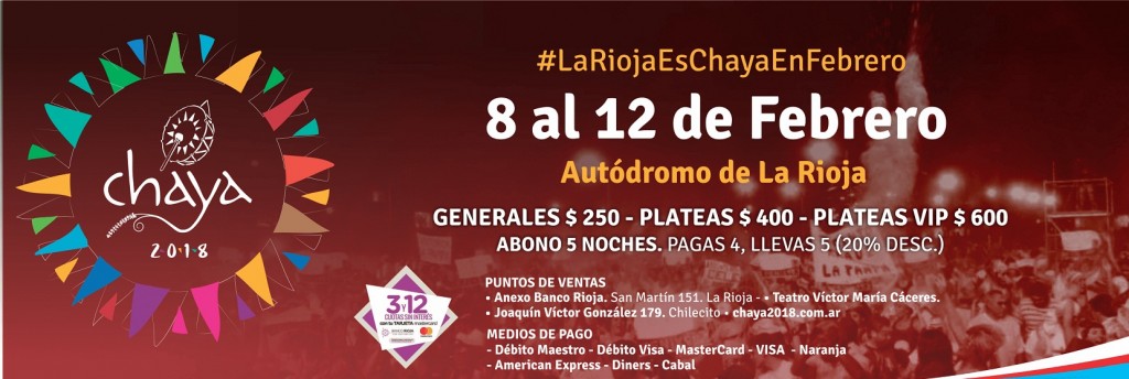 La organización de la Chaya dispuso que el valor de las entradas será de $ 250 las generales, $ 400 las plateas y $ 600 las VIP. Mientras que los abonos saldrán a la venta este viernes 2 y comprando para las 5 noches se abonará solo 4, lo que significa un descuento de un 20%.