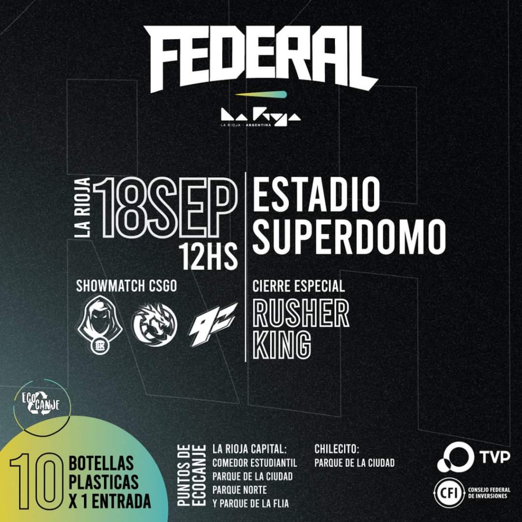 En tanto que el domingo 18 en el Súperdomo y por la Federal Esports Cup, se enfrentarán en un showmatch competitivo los equipos de Valorant Femenino de KRÜ y 9z, mientras que Leviatán y Undead BK tendrán su mano a mano en el videojuego League of Legends. Ambos desafíos tendrán un premio acumulado de 2 millones de pesos para el ganador de la partida. Además, el cierre del evento estará a cargo del artista de trap argentino Thomás “Rusherking” Tobar.