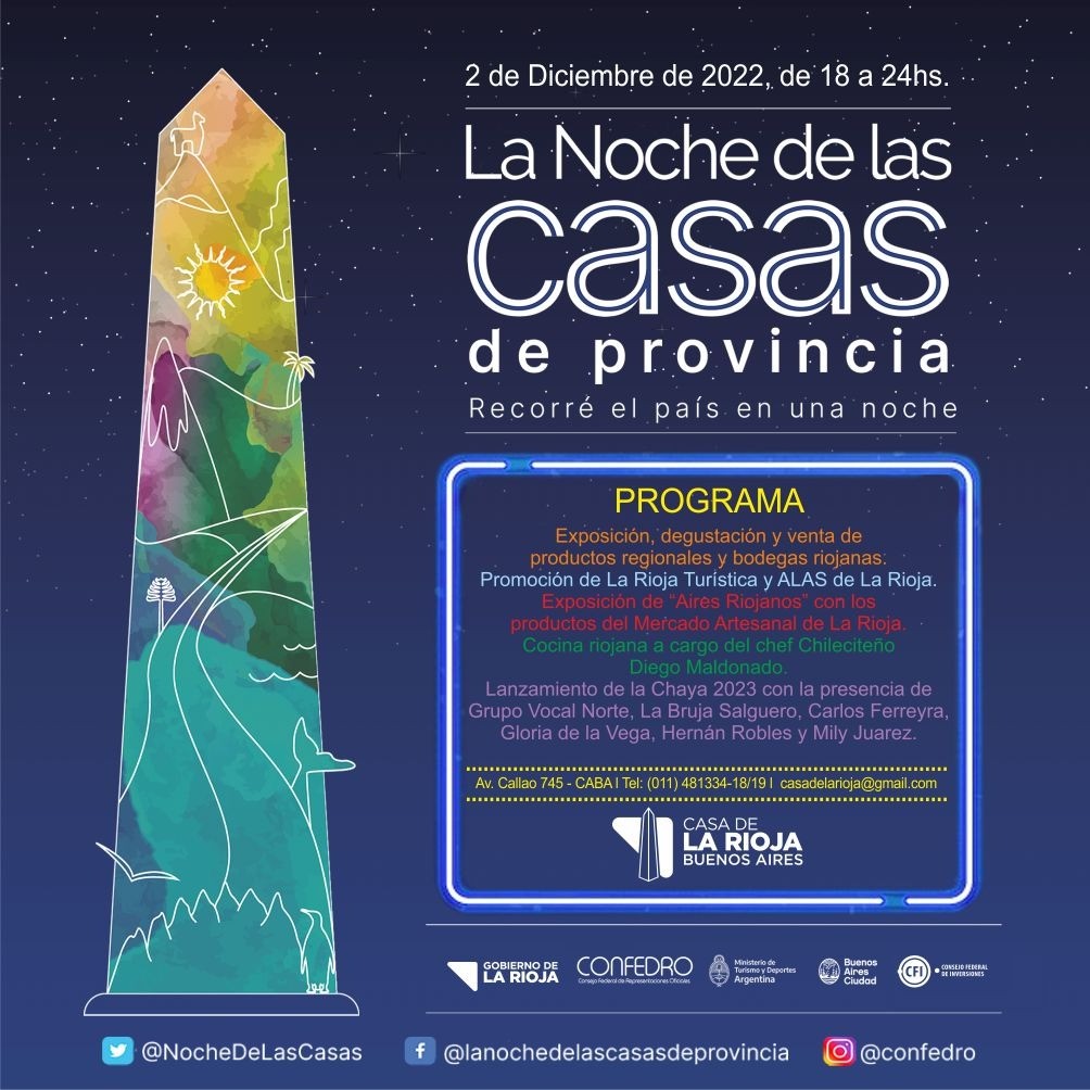 “La Noche de las Casas” es un evento en el que las representaciones provinciales en la Ciudad Autónoma de Buenos Aires, ofrecen un paseo nocturno con todas las manifestaciones culturales, productivas, turísticas y sociales, que cada provincia posee como patrimonio federal.