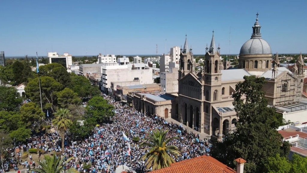 Todavía no se habían acomodado los corazones de tanta emoción por la definición del partido más importante para los amantes del fútbol, y para los no tan amantes también y la plaza 25 de mayo de la capital riojana ya mostraba un colorido festejo por la obtención de la Copa del Mundo.