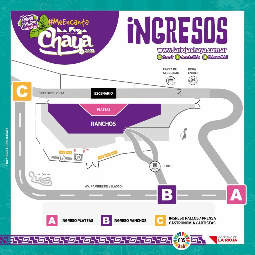 Desde la Policía informaron que los ingresos habilitados serán: Ingreso A, ubicado hacia el lado Sudeste del Autódromo Ciudad de La Rioja, por Av. Yacampis, para el público del sector Platea; el Ingreso B, hacia el lado Sur de dicho predio (entrada principal del Autódromo La Rioja) estará habilitado para los ciudadanos que asistan al sector Ranchos; y el Ingreso C, en el lado Oeste por calle Fray Bernardino Gómez, será el ingreso permitido para artistas, prensa, autoridades gubernamentales y demás áreas intervinientes, como así también el público que concurra a los sectores Palcos Gastronómicos.