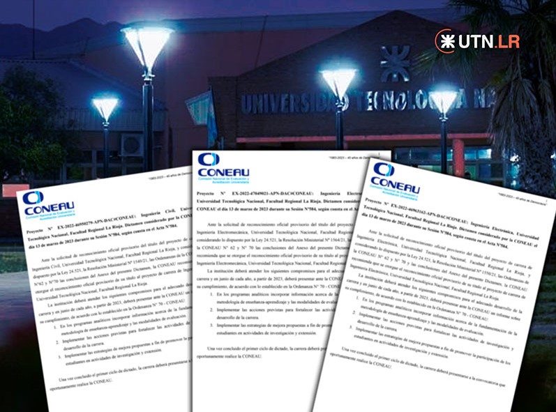 La Comisión Nacional de Evaluación y Acreditación Universitaria (CONEAU) aprobó las 3 carreras de Ingeniería Civil, Ingeniería Electromecánica e Ingeniería Electrónica, bajo los nuevos estándares de formación por competencias y aprendizaje basado en el alumno, que se dictan en la Facultad Regional La Rioja, de la Universidad Tecnológica Nacional (UTN).