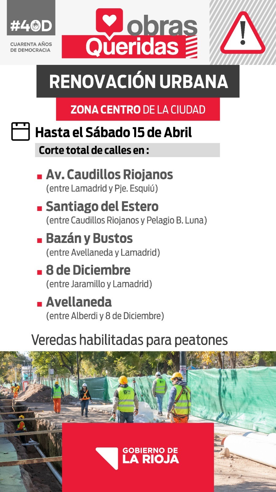 En el marco de las obras que el Gobierno de La Rioja ejecuta para la Renovación Urbana del área central y desagües pluviales, se comunica el corte de calles a fin de mejorar la circulación vehicular y asegurar la transitabilidad en el sector.
