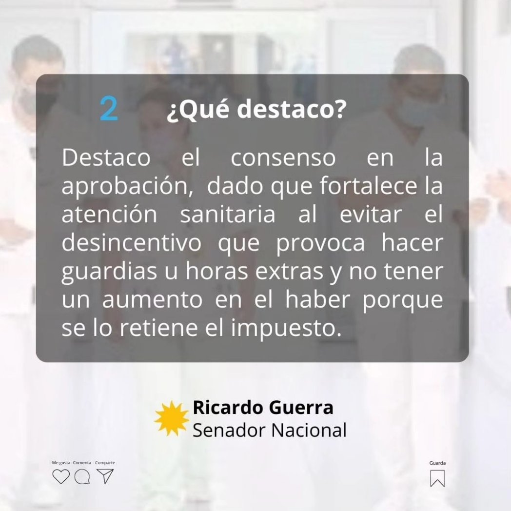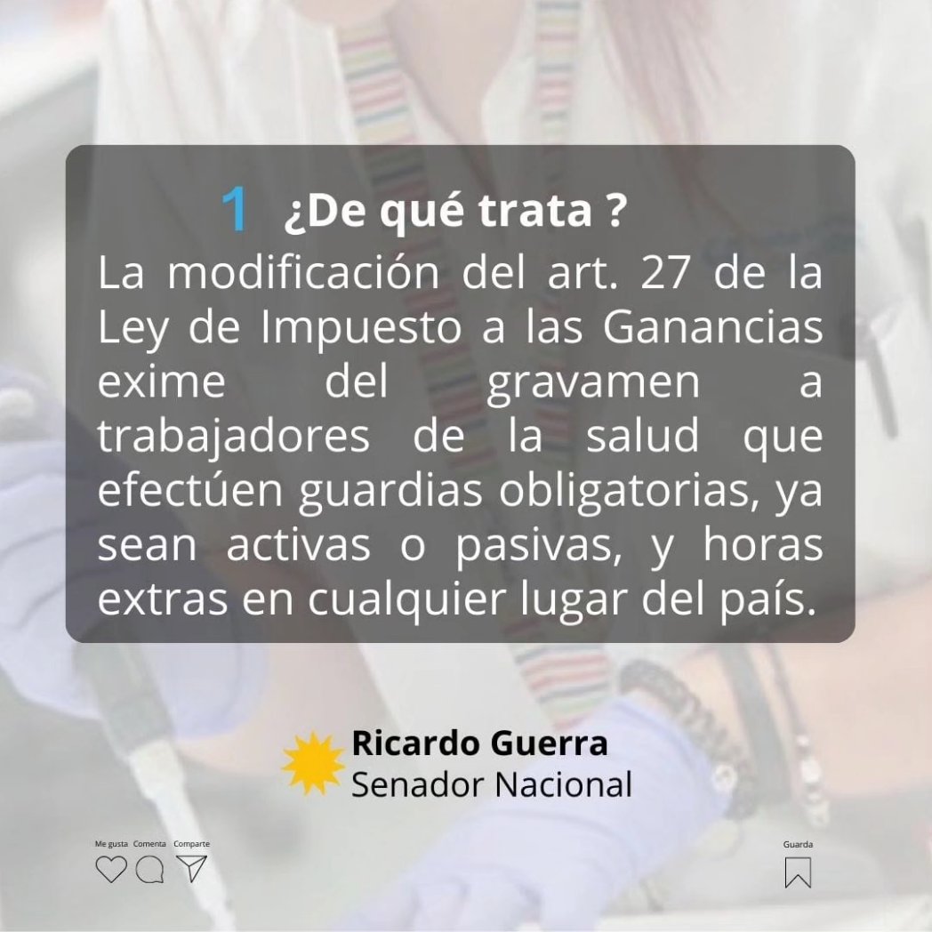 Con un posteo en su cuenta de Twitter, el presidente de la Comisión de Presupuesto del Senado, Ricardo Guerra, explicó los alcances de la media sanción aprobado recientemente para que trabajadores de la salud no sean alcanzados por este gravamen cuando realicen guardias u horas extras.