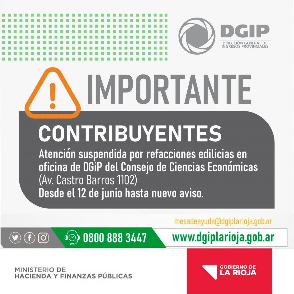 La Dirección de Ingresos Provinciales informa que la oficina descentralizada, ubicada en el Consejo de Ciencias Económicas (Av. Castro Barros 1102) estará cerrada desde este lunes 12 de junio hasta nuevo aviso debido a refacciones que se realizarán en el edificio.