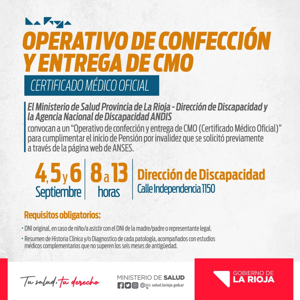 El Ministerio de Salud Provincia de La Rioja, junto a la Dirección de Discapacidad y la Agencia Nacional de Discapacidad ANDIS, convocan a un “Operativo de confección y entrega de CMO (Certificado Médico Oficial)” para cumplimentar el inicio de Pensión por invalidez que se solicitó previamente a través de la página web de ANSeS.