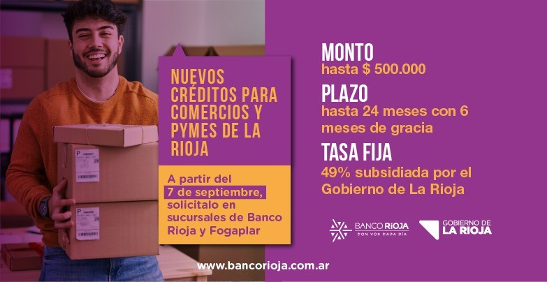 A partir de este jueves, 7 de septiembre, las pequeñas y medianas empresas radicadas en la provincia de La Rioja podrán solicitar este crédito, para lo cual deberán dirigirse tanto a la Casa Central del Banco de La Rioja (Rivadavia 702) y sucursales de la entidad bancaria, de lunes a viernes en los horarios de 08 a 13:00 como así también por las oficinas de FOGAPLAR, ubicadas en Av. Perón 444.