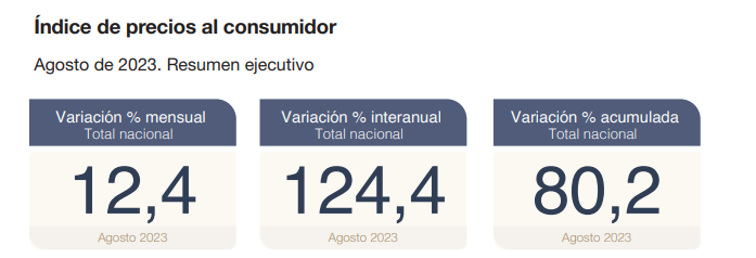 El Índice de Precios al Consumidor (IPC) aumentó 12,4% en agosto y un 124,4% en la medición interanual, con lo que acumula un alza de 80,2% en los primeros ocho meses del año, informó el Instituto Nacional de Estadísticas y Censos (Indec).