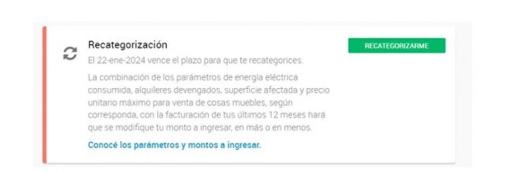Una vez allí, seleccionar la opción “Recategorizarme” y automáticamente, el sistema informará la categoría actual del contribuyente y los topes de cada parámetro de esa categoría. Luego se debe seleccionar la opción “Continuar recategorización”.