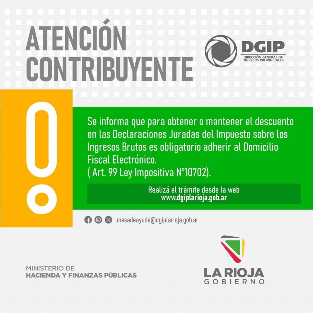 El Ministerio de Hacienda y Finanzas Públicas, por intermedio de Dirección General de Ingresos Provinciales, informa a los contribuyentes que para obtener o mantener el descuento estipulado en las Declaraciones Juradas del Impuesto sobre los Ingresos Brutos es obligatorio adherir al Domicilio Fiscal Electrónico. El tramite se hace via online.