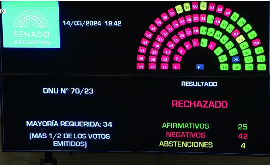 El Senado rechazó el DNU 70/23 promulgado en diciembre por el presidente Javier Milei. Es la primera vez que la Cámara alta no aprueba un Decreto de Necesidad y Urgencia y traslada la responsabilidad al Congreso para saber que terminará pasando con el instrumento presentado por el ejecutivo nacional. Se escucharon voces a favor y en contra de lo dispuesto por senadores.