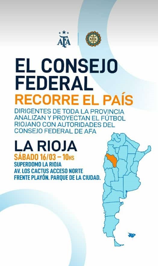 Este sábado a las 10 en el Superdomo, la dirigencia del Consejo Federal del Fútbol Argentino realizará una jornada de análisis, debate y exposición de la tarea que realizan Federaciones y Ligas del país. El encuentro será presidido por el titular de la Liga Riojana y Secretario Ejecutivo del Consejo, Gabriel Godoy, el secretario de Coordinación del Consejo, Mario Echeverría, y el presidente de la Federación Riojana de Fútbol, Juan Pablo Ceballos.