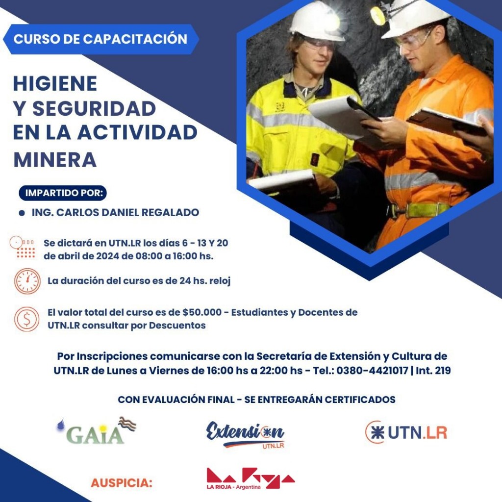 El Gobierno de la Provincia, a través de la Secretaría de Minería, junto a la Universidad Tecnológica Nacional- Facultad Regional La Rioja- y el Grupo de Actividades Ambientales (GAIA), concretarán el curso de capacitación denominado Higiene y Seguridad en la Actividad Minera.