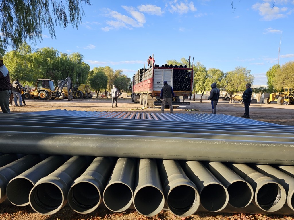 Este sábado por la mañana, llegó el primero de dos camiones con la cañería esencial para la ejecución de estos trabajos, como lo son los primeros seiscientos cincuenta tubos de diámetro de ciento sesenta que conducirán mayor caudal de agua a la ciudad de Chepes.