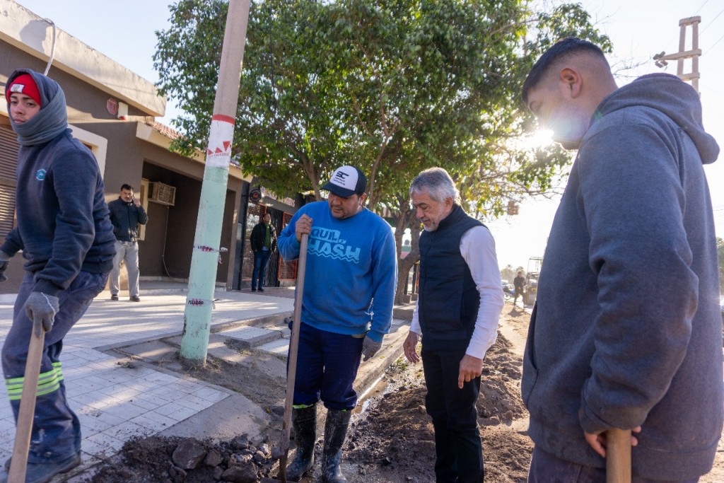 El intendente, Armando Molina, dialoga con trabajadores de Aguas Riojanas constatando que se realicen los arreglos en las cañerÃas, antes que el municipio proceda a colocar la carpeta asfáltica.