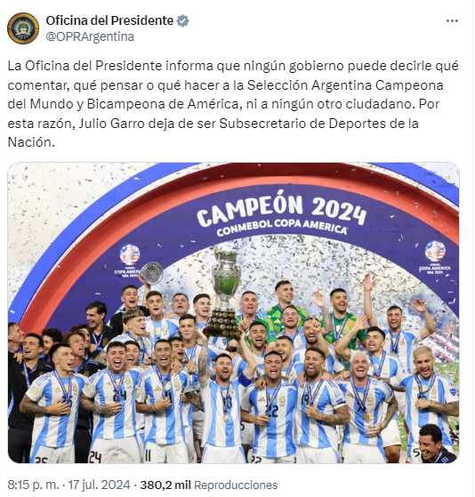 El comunicado emanado desde el gobierno nacional precisa que "ningún gobierno puede decirle qué comentar, qué pensar o qué hacer a la Selección Argentina Campeona del Mundo y Bicampeona de América, ni a ningún otro ciudadano. Por esta razón, Garro deja de ser subsecretario de Deportes de la Nación".