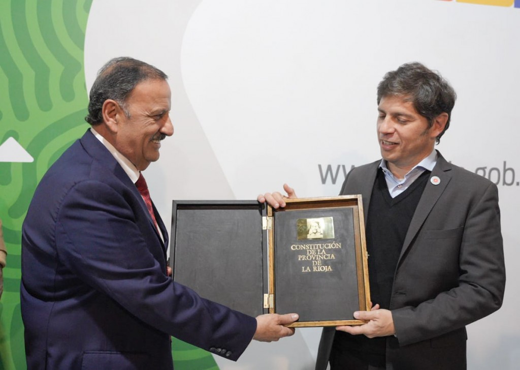 Tras la firma de los convenios, el gobernador de La Rioja, Ricardo Quintela, le entrega un ejemplar de la nueva Constitución de la provincia al gobernador bonaerense, Axel Kicillof.