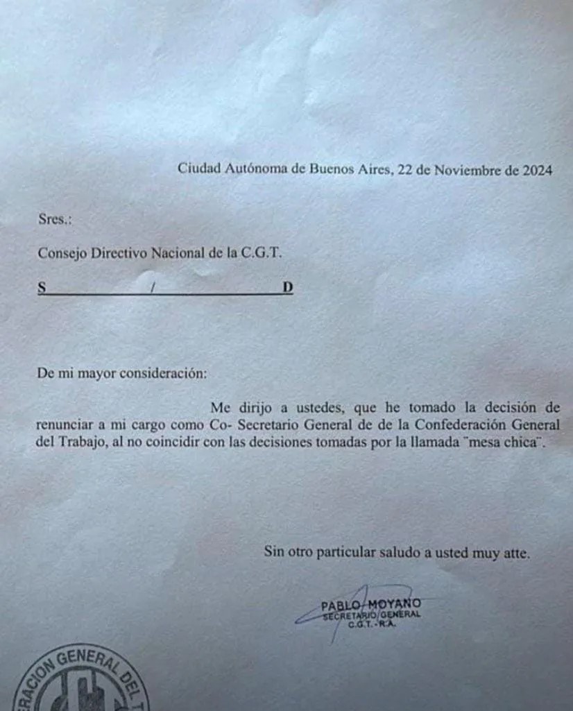 El secretario adjunto del sindicato de Camioneros, Pablo Moyano, renunció al triunvirato que conduce la CGT, en desacuerdo "con las decisiones tomadas por la mesa chica" de la central, controlada por los dirigentes "dialoguistas" y lo hizo saber mediante una escueta carta dirigida al Consejo Directivo de la central obrera.