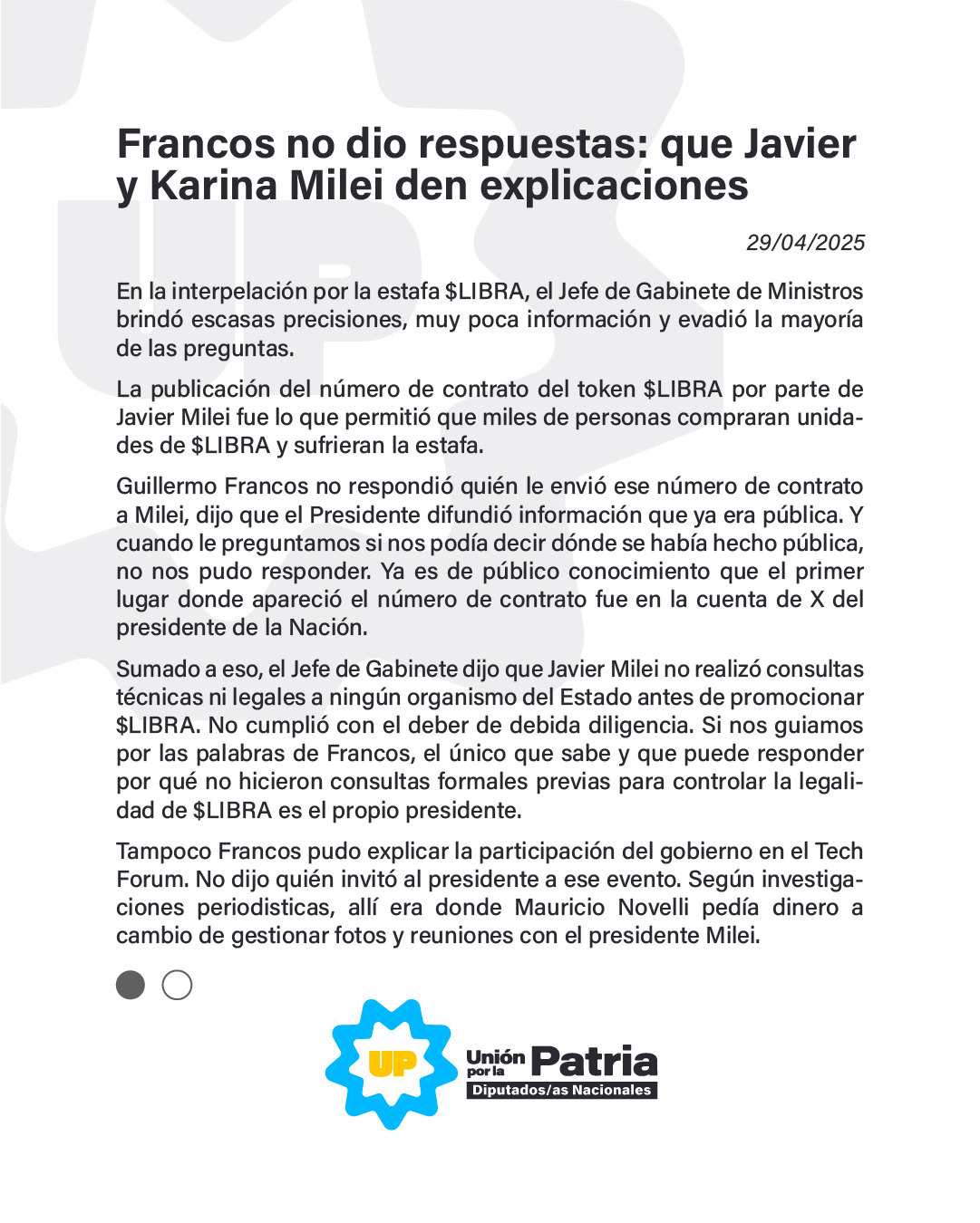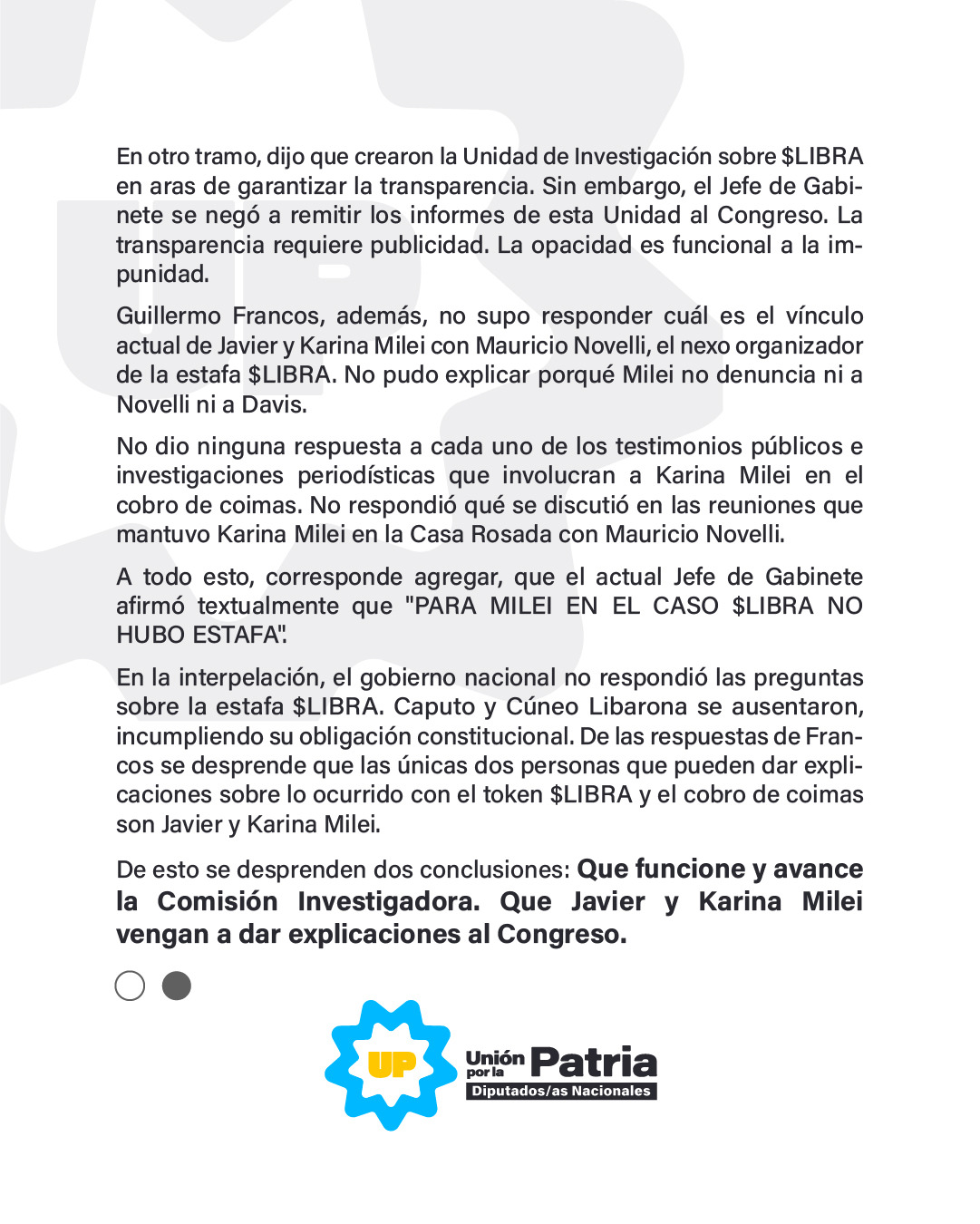 Pedrali, anexa a su publicación el pronunciamiento del bloque de diputados de Unión por la Patria, en relación a la exposición de Francos que para los legisladores dejó mas dudas que certezas y propician que tanto Javier como Karina Milei sean convocados al recinto para ser interpelados en relación a la estafa de $Libra.