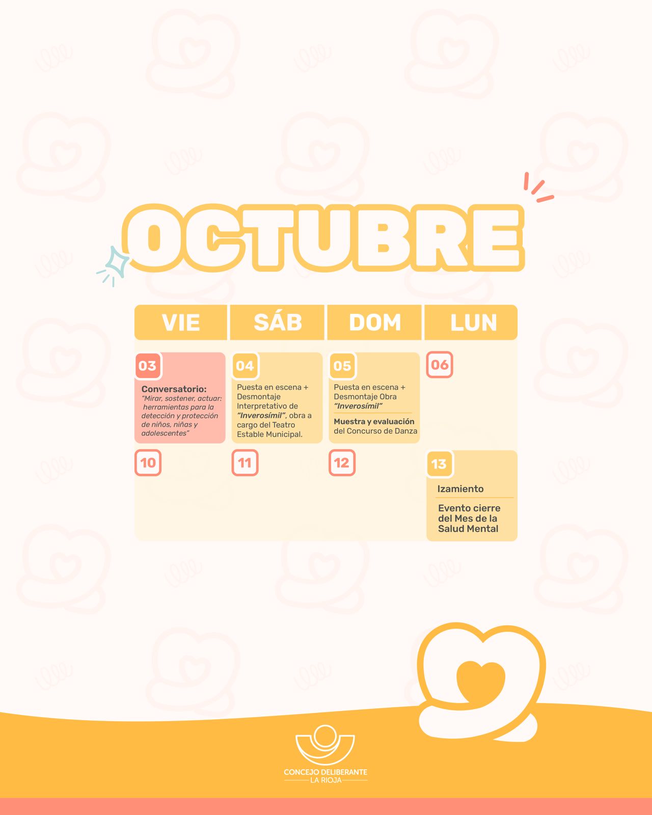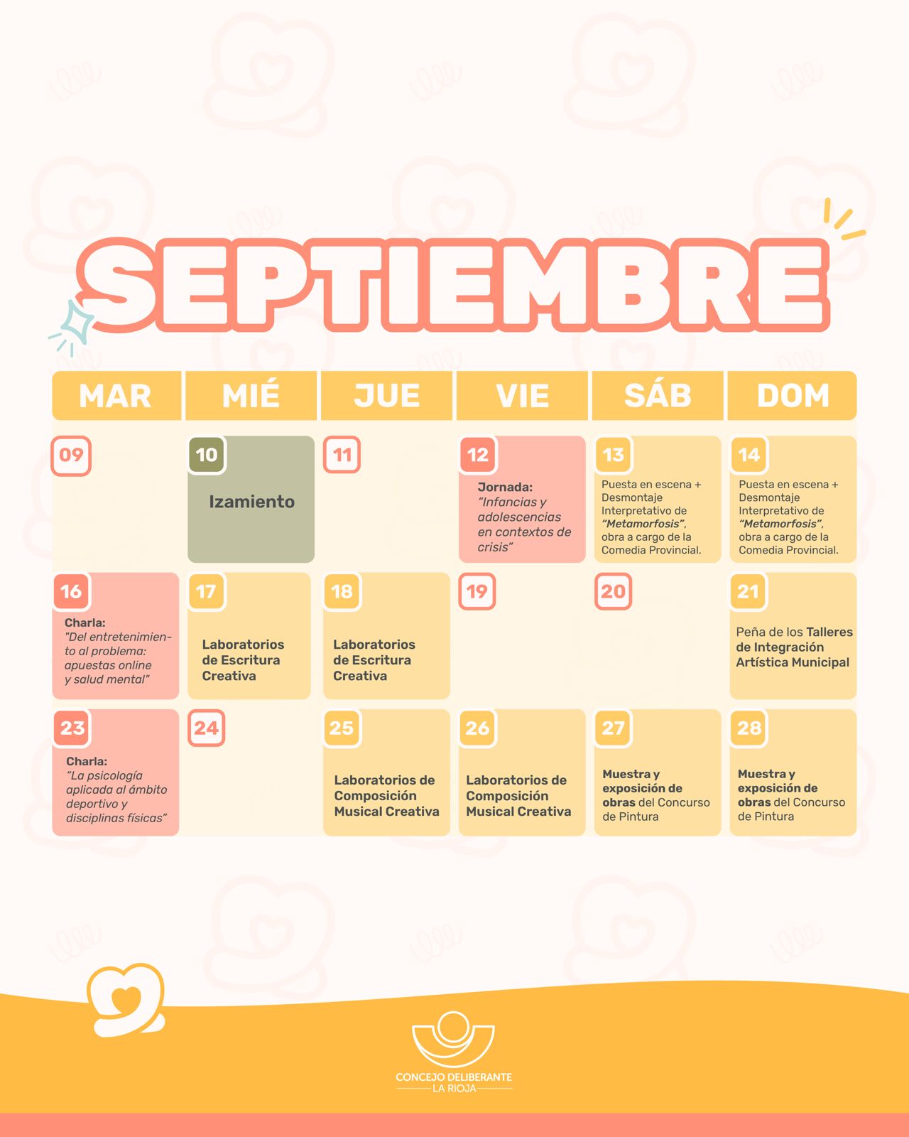 El mes dará inicio con el tradicional izamiento de banderas en la Municipalidad de la Capital, seguido de una amplia agenda de actividades organizada en tres ejes: formación académica, participación comunitaria y sensibilización/concientización, y que tendrá lugar desde el 10 de septiembre —Día Mundial de la Prevención del Suicidio— hasta el 13 de octubre —Día del Psicólogo y la Psicóloga.