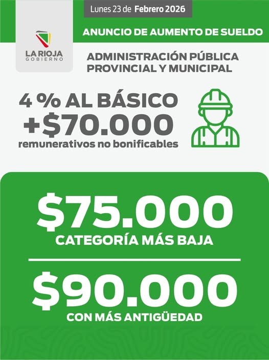 El gobierno de la provincia otorgará un incremento salarial a los trabajadores de la Administración Pública Provincial que tendrá impacto con los sueldos percibidos en el mes de marzo. La medida alcanzará al conjunto de los agentes públicos provinciales y municipales, con mejoras que promedian entre 11 % y 14 %, combinando aumentos al salario básico y sumas fijas remunerativas y no remunerativas.