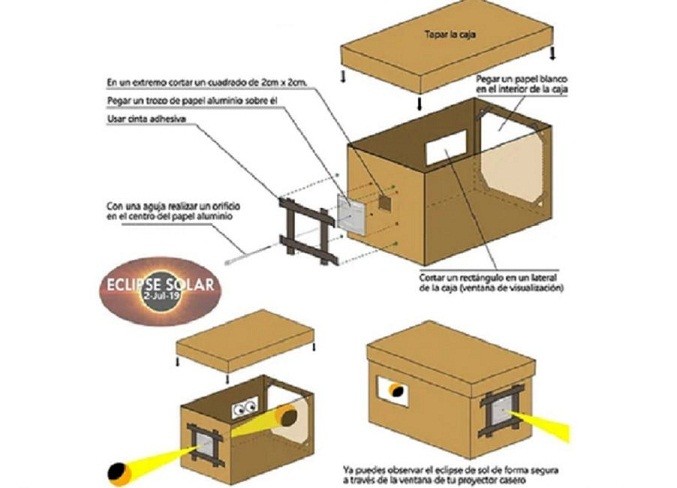 Este dispositivo es una caja oscura que permite la observación del eclipse solar sin dañar la vista, una de las mejores formas de observación es a través de dispositivos apropiados como lentes de eclipse, filtros de 14 din. En el caso de no contar con protector visual solar apropiado, una de las mejores formas de observar un eclipse solar es mediante la construcción de un proyector casero o una caja oscura.