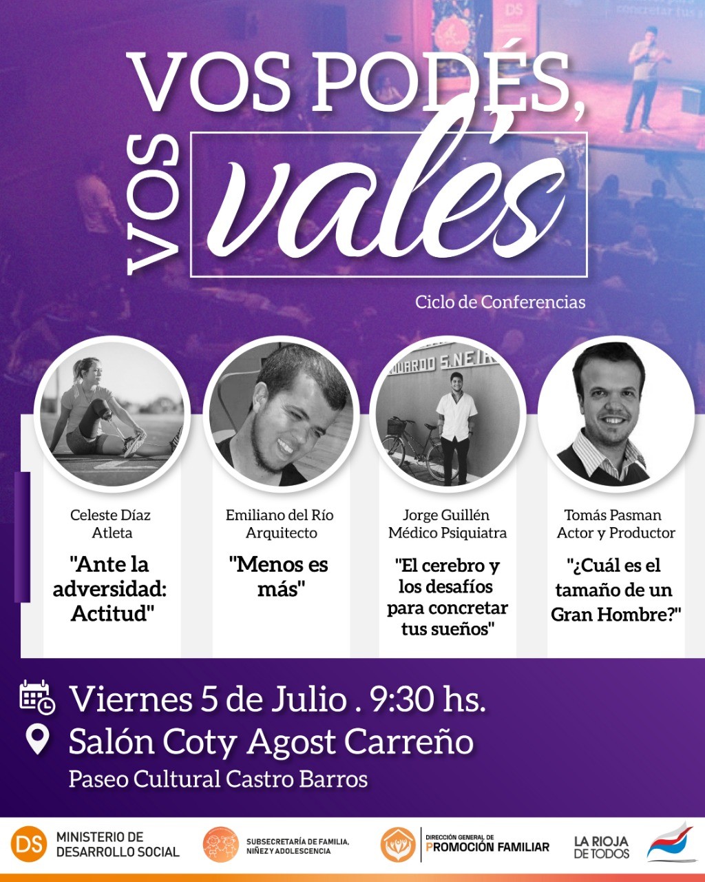 El ciclo de charlas motivacionales "Vos Podés, Vos Valés", es una iniciativa del Ministerio de Desarrollo Social que busca inspirar a los adolescentes mediante historias de superación. Tendrá lugar este viernes 5 de julio en la sala Coty Agost Carreño en el marco de la Feria del Libro 2019.