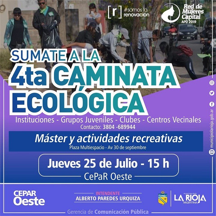 La Municipalidad de La Rioja a través de la Subsecretaría de zona Oeste realizará este jueves 25 de julio la 4ta. Caminata Ecológica bajo el lema “La ciudad más limpia, es la que menos se ensucia”.